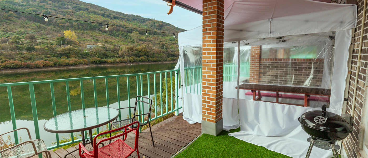 비 오는 날도, 겨울에도 걱정 없이 바비큐! 실외 바비큐 공간에는 투명 방풍 텐트가 설치되어 있어 사계절 내내 바비큐를 즐길 수 있습니다. 숯불에 구워내는 고기와 호수 풍경이 함께하는 특별한 저녁을 경험하세요